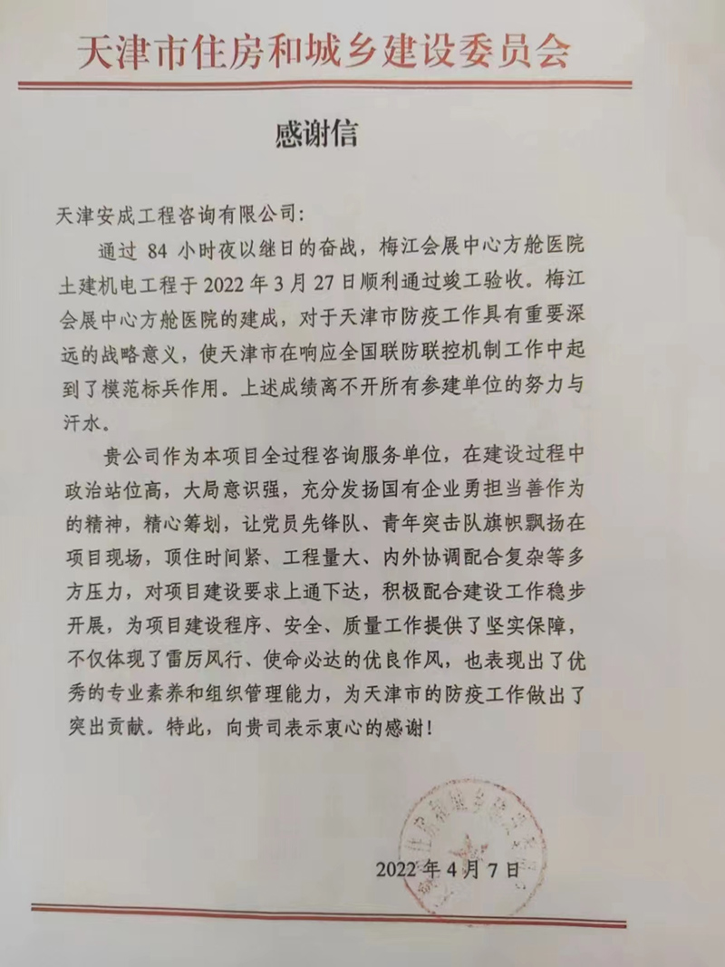 經(jīng)過84小時夜以繼日的奮戰(zhàn),梅江會展中心土建機電工程于2022年3月27日順利通過竣工驗收。4月7日,天津市住房和城鄉(xiāng)建設(shè)委員會向安成公司發(fā)來感謝信,對安成公司在項目建設(shè)過程中體現(xiàn)出的雷厲風(fēng)行、使命必達的優(yōu)良作風(fēng)以及優(yōu)秀的專業(yè)素養(yǎng)和組織管理能力給予了高度認(rèn)可。